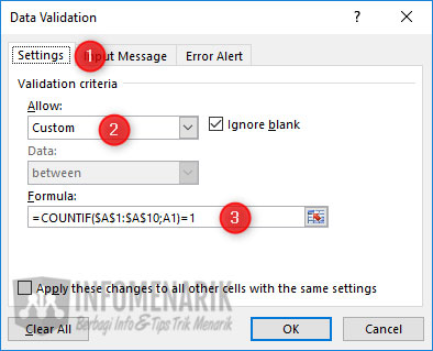 Setelah jendela Data Validation tampil, silakan Kamu klik tab Settings. Pada tab Settings, Kamu pilih Custom pada Allow dan biarkan pada Ignore blank untuk dicentang. Selanjutnya pada Formula Kamu isi dengan fungsi =COUNTIF($A$1:$A$10;A1)=1. Fungsi ini Kamu sesuaikan dengan cell yang Kamu blok tadi, atau cell yang akan di validasi.