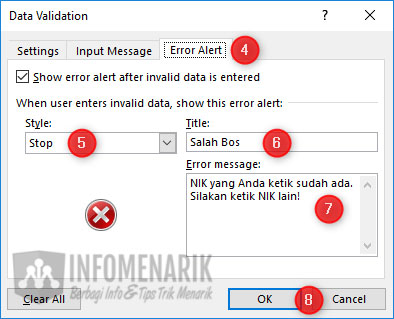 Selanjutnya Kamu pilih tab Error Alert. Pada tab ini Kamu isi dengan isi pesan yang akan tampil pada kotak dialog kesalahan data. Jika nanti terjadi kesalaha ketika entry data, maka pesan yang tampil adalah sesuai dengan yang Kamu setting pada tab Error Alert ini.