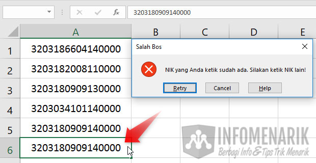 Selesai dan kini saatnya untuk menguji proyek kita apakah sukses atau tidak. Silakan Kamu coba ketikkan data pada cell yang sudah Kamu validasi tadi. Sebagai contoh saya coba mengetik data NIK pada range A6 disamakan dengan data di A5. Setelah di Enter data tidak bisa ditampilkan dan malah tampil kotak peringatan.